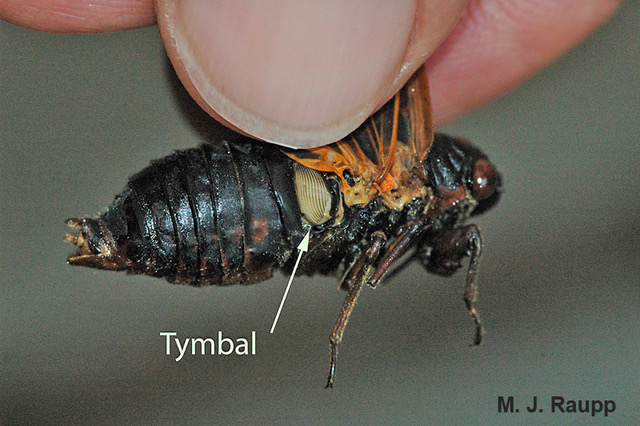 "These bugs emerge synchronously and in tremendous numbers every 17 years, sometimes more than 1.5 million individuals per acre, to aggregate into chorus centers, producing their distinctive 'weeeee-whoa' or ‘Pharaoh' calls to attract mates. They sing by vibrating their tymbals, or cartilageneous clickers, into abdominal resonation chambers. (Some derivations trace the name to kikkos, membrane + aeidw, singer, so, literally, 'membrane singer.') Cicada choruses can produce sounds louder than 106 dB (SPL), among the loudest of all insect-produced sounds. These abdominal Helmholtz resonators also generate energy that travels through cicada bodies to induce strong vibrations in the substrate, what we might call the 'seismic channel,' in addition to the airborne signals we hear.