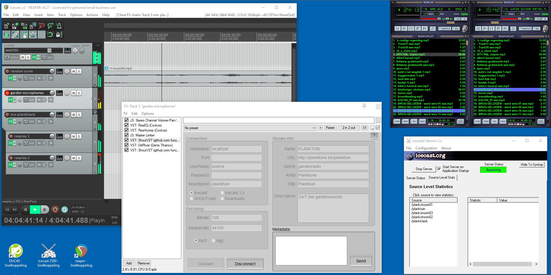* DUC 4.11 to stay connected with the “www” as I have a dynamic IP address that changes out of my control * ICECAST2 v2.x as icecast server * REAPER as playback and live-input mixer it has some plug-ins running - 5 ICECAST clients ( I have some experimental streams running ) - compressor, eq, effect’s - 2 players
