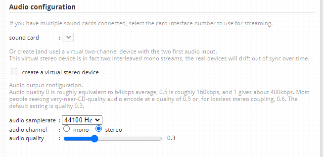 My settings in streambox.txt: # --------------------------------------------------------------------------------------------------------------------- # ADVANCED AUDIO CONFIGURATION # --------------------------------------------------------------------------------------------------------------------- # IQaudIO audio card settings. # # - IQAUDIO_INPUT, select one input below (default "mems") : # # - mems to record from the on board digital MEMS microphone # - mic to record from the mono/stereo mic input (electret) # - aux to record from the stereo aux input IQAUDIO_INPUT="mems" # - IQAUDIO_MEMS_GAIN, MEMS input gain : min=-6.00dB max=36.00dB (default 24) # - IQAUDIO_MIC_L_GAIN, mic input gain (left) : min=-6.00dB max=36.00dB (default 24) # - IQAUDIO_MIC_R_GAIN, mic input gain (right) : min=-6.00dB max=36.00dB (default 24) # - IQAUDIO_AUX_GAIN, stereo aux input gain : min=-54.00dB max=15.00dB (default 0) # - IQAUDIO_MIX_PGA, mixin PGA (programmable-gain amplifier) : min=-4.50dB max=18.00dB (default 6) # - IQAUDIO_ADC_GAIN, ADC (Analogue to Digital Convertor) : min=-78.00dB max=11.25dB (default 0 for aux, 1.5 otherwise) IQAUDIO_MEMS_GAIN="24" IQAUDIO_MIC_L_GAIN="24" IQAUDIO_MIC_R_GAIN="24" IQAUDIO_AUX_GAIN="0" IQAUDIO_MIX_PGA="6" IQAUDIO_ADC_GAIN="1.5"