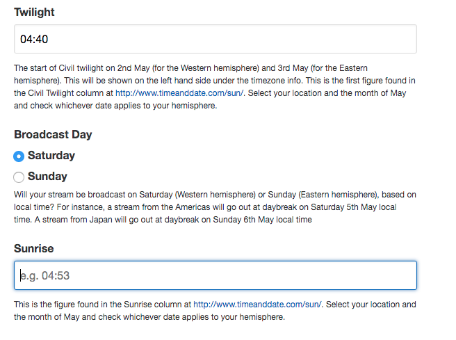 REVEIL STREAM http://streams.soundtent.org/2020/streams/utc0_newcastle-upon-tyne The figure for : civil twilight 04:40 is to be taken from the 2nd of May and not Saturday 5th May? (I've taken it from 2nd May as per the set up instructions - see attached image.) But, sunrise 05:17 is taken from the 5th of May?