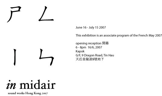 Cedric Maridet (France, Hong Kong 法國,香港) la mouvance des flux, 2007, streamed open-microphone [in partnership with audio research group locus sonus], computer generative system. venue: Kapok, G/F, 9 Dragon Road, Tin Hau, Hong Kong